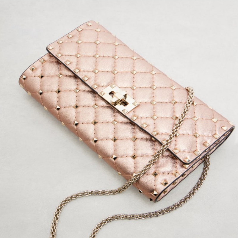 Aggiungi un tocco scintillante a qualsiasi look con questa borsa a spalla Rockstud Spike di Valentino Garavani. Realizzata in pelle metallizzata rosa, il modello presenta le iconiche decorazioni Rockstud della maison, una lunga tracolla a catena e una sicura chiusura a girello.